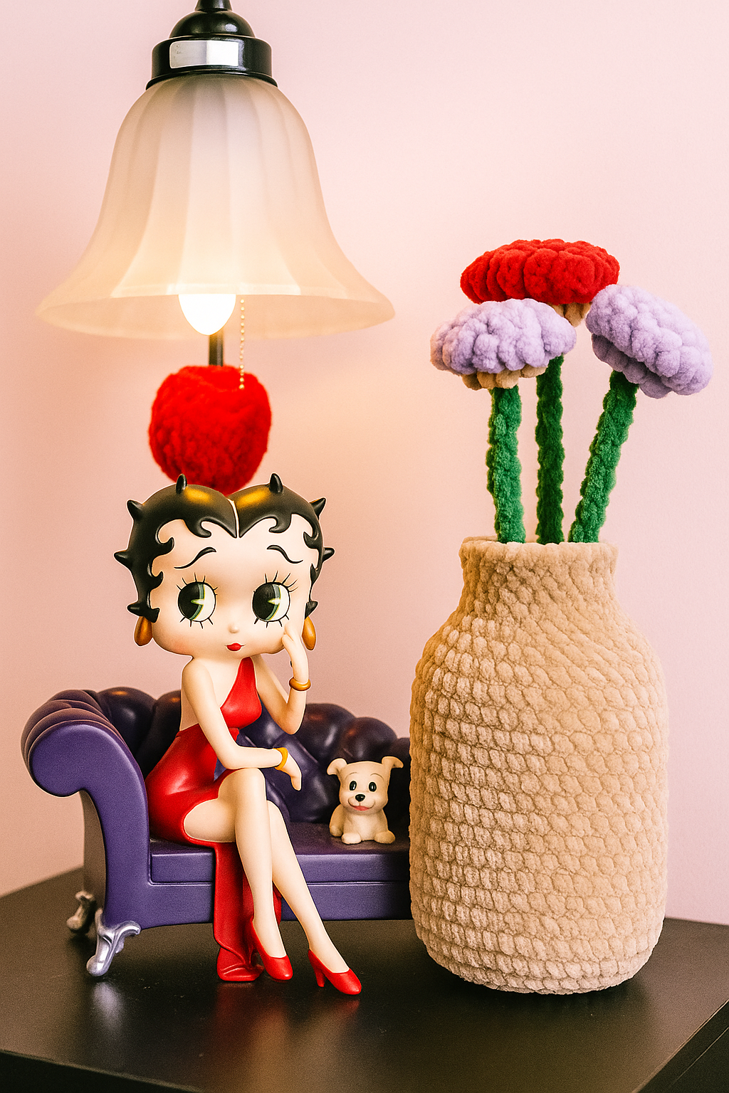 Installées bien au chaud dans leur vase tout doux, ces fleurs crochetées à la main resteront belles toute l’année… même quand vous oubliez leur existence pendant trois semaines.